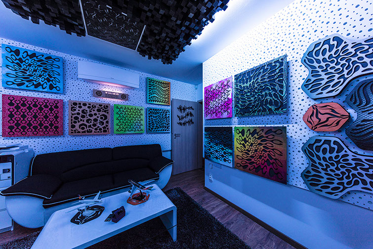 Acoustic treatment from a completely different perspective. Absorption & Diffusion with unlimited design ideas. Products that have absorbant properties made from special acoustic foam, fabric and wood. With the help of our acoustic measurement services, our products will be applied to the correct position in your room or studio. THION gives you versatile functional art and a unique touch for any interior.